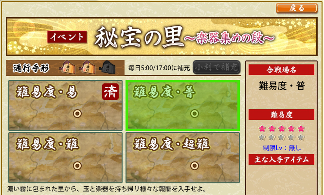 【刀剣乱舞】E-2「秘宝の里・難易度”普” 」攻略検証会場【審神者会議記事】 2017年06月13日17:43 カテゴリ:審神者秘宝の里〜楽器集め〜(6月) 0 コメント Tweet お世話になっています。とうらぶ速報管理人です。 今回のイベントに管理人自ら出陣します。この記事は「審神者会議」ということでイベントの攻略やなどの情報を共有しこのブログを見ている審神者達が協力しあって挑んで欲しいと思い「会議」にしました。特にコメントの書き方に決まりはありません。質問、部隊編成、息抜きに何をしているかなどイベントのこと何でも大丈夫です。みんなで楽しくやっていけたらと思っています。ぜひご協力、ご参加お願いたします。 <欲しい情報>・敵部隊編成・クリアした部隊編成<各秘宝の里移動>E-1/ E-3/ E-4/<ステージ2:難易度”普”>・難易度・普………「戦国の記憶 三方ヶ原(3-2)」の難易度 ・通行手形は毎日5:00と17:00に最大まで回復します。・ボスに勝利すると稀に楽器を入手・出現絵札玉20/敵打4/敵太4/敵槍4/怪火2/毒矢2/落とし穴2/焙烙玉2/<マップ><基礎経験値>ボス・敵編成<打刀札><太刀札> 2枚目<槍札> <ボス札> 「審神者」カテゴリの最新記事 「秘宝の里〜楽器集め〜(6月)」カテゴリの最新記事 ※二次創作などの誹謗中傷コメントは管理人の判断で削除させていただきます。 悪質の場合「コメント禁止」になります。(「削除されました」と表示されます。) ※荒れそうな内容のコメントがあった場合は反応せずスルーでお願い致します。 ※イラストに全く関係ない雑談は禁止です。(違反した場合コメント削除) ※Twitterの反応がない場合はコメント欄から抜粋して掲載いたします。 反応がない記事には積極的にコメントをお願いします。 コメントする コメントフォーム 名前 コメント 記事の評価 リセット リセット 顔 星 情報を記憶 コメントを投稿する