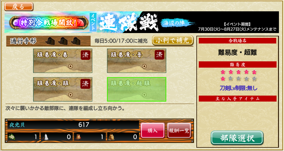 「連隊戦 ~海辺の陣~」の水砲戦で、敵の「水砲兵」を撃破した際、まれに「虹色の夜光貝」を獲得できます。 「虹色の夜光貝」を7個集めると「特別合戦場」に出陣できます。
