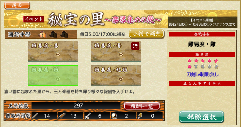 【刀剣乱舞】E-3「秘宝の里・難易度”難” 」攻略検証会場【審神者会議記事】 2019年09月24日21:07 カテゴリ:審神者秘宝の里〜楽器集め〜(9月) 0 コメント Tweet お世話になっています。とうらぶ速報管理人です。 今回のイベントに管理人自ら出陣します。この記事は「審神者会議」ということでイベントの攻略やなどの情報を共有しこのブログを見ている審神者達が協力しあって挑んで欲しいと思い「会議」にしました。特にコメントの書き方に決まりはありません。質問、部隊編成、息抜きに何をしているかなどイベントのこと何でも大丈夫です。みんなで楽しくやっていけたらと思っています。ぜひご協力、ご参加お願いたします。 <欲しい情報>・敵部隊編成・クリアした部隊編成<各秘宝の里移動>E-1/ E-2/ E-4/<ステージ3:難易度”難”>・難易度・難………「武家の記憶 博多湾(5-2)」の難易度・通行手形は毎日5:00と17:00に最大まで回復します。・ボスに勝利すると稀に楽器を入手・出現絵札玉20/敵脇1/敵打4/敵太4/敵槍4/怪火1/毒矢2/焙烙玉1/ <マップ><基礎経験値>ボス・敵編成<打刀札>2枚目 <太刀札><槍札>2枚目 3枚目<ボス札> 「審神者」カテゴリの最新記事 「秘宝の里〜楽器集め〜(9月)」カテゴリの最新記事 ※二次創作などの誹謗中傷コメントは管理人の判断で削除させていただきます。 悪質の場合「コメント禁止」になります。(「削除されました」と表示されます。) ※荒れそうな内容のコメントがあった場合は反応せずスルーでお願い致します。 ※イラストに全く関係ない雑談は禁止です。(違反した場合コメント削除) ※Twitterの反応がない場合はコメント欄から抜粋して掲載いたします。 反応がない記事には積極的にコメントをお願いします。 コメントする コメントフォーム 名前 コメント 記事の評価 リセット リセット 顔 星 情報を記憶 コメントを投稿する