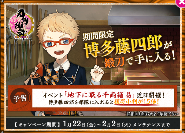 【刀剣乱舞】本日のメンテでイベント「地下に眠る千両箱」を実施!「後藤藤四郎」や「博多藤四郎」が入手できるぞおお 2016年01月26日 カテゴリ:メンテナンス刀剣乱舞 1 コメント Tweet 続きを読む